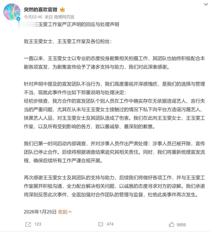 1月25日凌晨这一下其实很狠,王玉雯工作室直接全平台发声明,话说得很清楚,相关问题没被合理妥善解决前,《突然的喜欢》的一切宣传先停掉,不配合也不打太极,先把态度摆出来 。