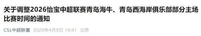 为满足球迷观赛需求,经主场俱乐部申请,并协商属地赛区、客队俱乐部及相关方同意后,现决定调整2026怡宝中超联赛青岛海牛、青岛西海岸俱乐部部分主场的比赛时间,其他比赛安排不变,具体调整如下: