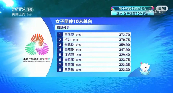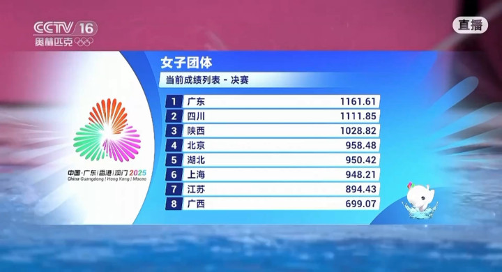 在女子团体双人3米跳板比赛中,广东队凭借奥运冠军陈艺文和世界冠军搭档林珊的出色发挥,暂居第一位。