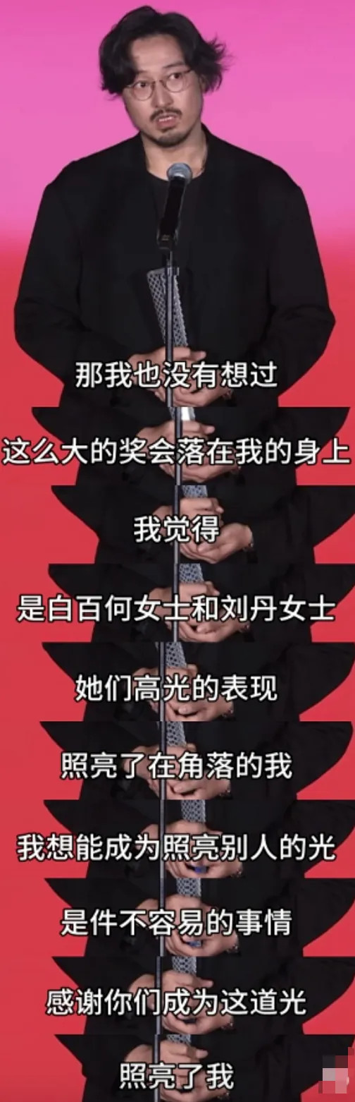 “他自己都知道理亏,获奖感言说得像在谢罪,生怕别人骂他抢了白百何的奖。”