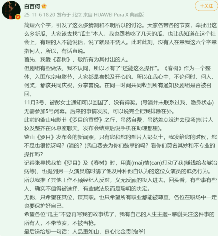 她被骂“沪圈操盘手”,却急着撇清:“我不认识白百何,也不认识《春树》片方,更不知道什么是沪圈!”