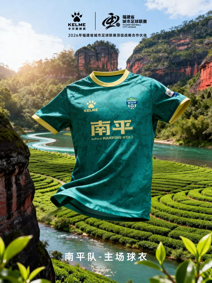 主场球衣通体“武夷绿”为底,将茶山、丹岩、云海凝于战袍,两肩晕染茶园实景,岩石肌理复刻九曲溪丹霞地貌。