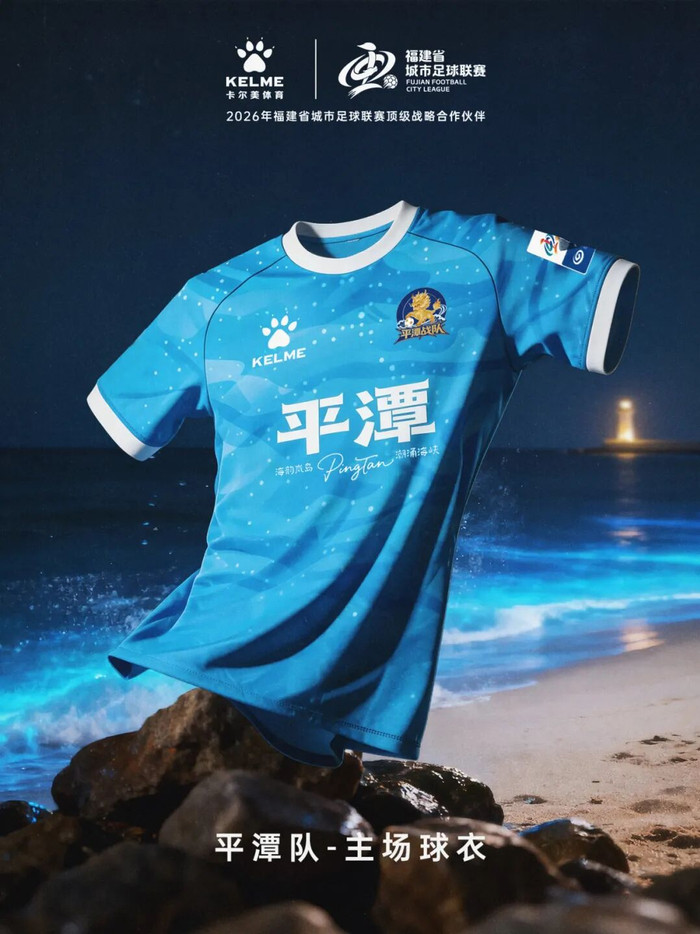 主场球衣以平潭标志自然奇观“蓝眼泪”为底色,浪潮波纹还原大海潮汐起伏的韵律,星星点点的荧光光斑形成璀璨光轨。