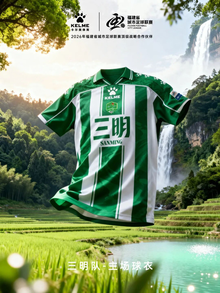 主场球衣以“中国绿都”为魂,森林绿与纯白间条交织,蜿蜒水纹如沙溪穿城、层叠山脊似丹霞起伏。