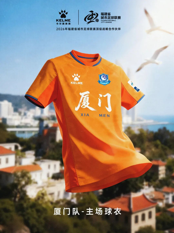 主场球衣以“嘉庚橙”为底色,双子塔轮廓竖向分割,象征厦门向上生长的城市精神。
