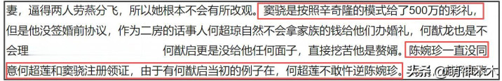 虽然窦骁也按照何超盈老公的做法,给了500万彩礼,但是他不肯签署婚前协议,所以三太陈婉珍就一直不同意两人领证,何超莲自己处境也很尴尬,至今没能凭借家族联姻或者生孩子,拿到更多实际利益或者进入家族企业,更别提窦骁了。