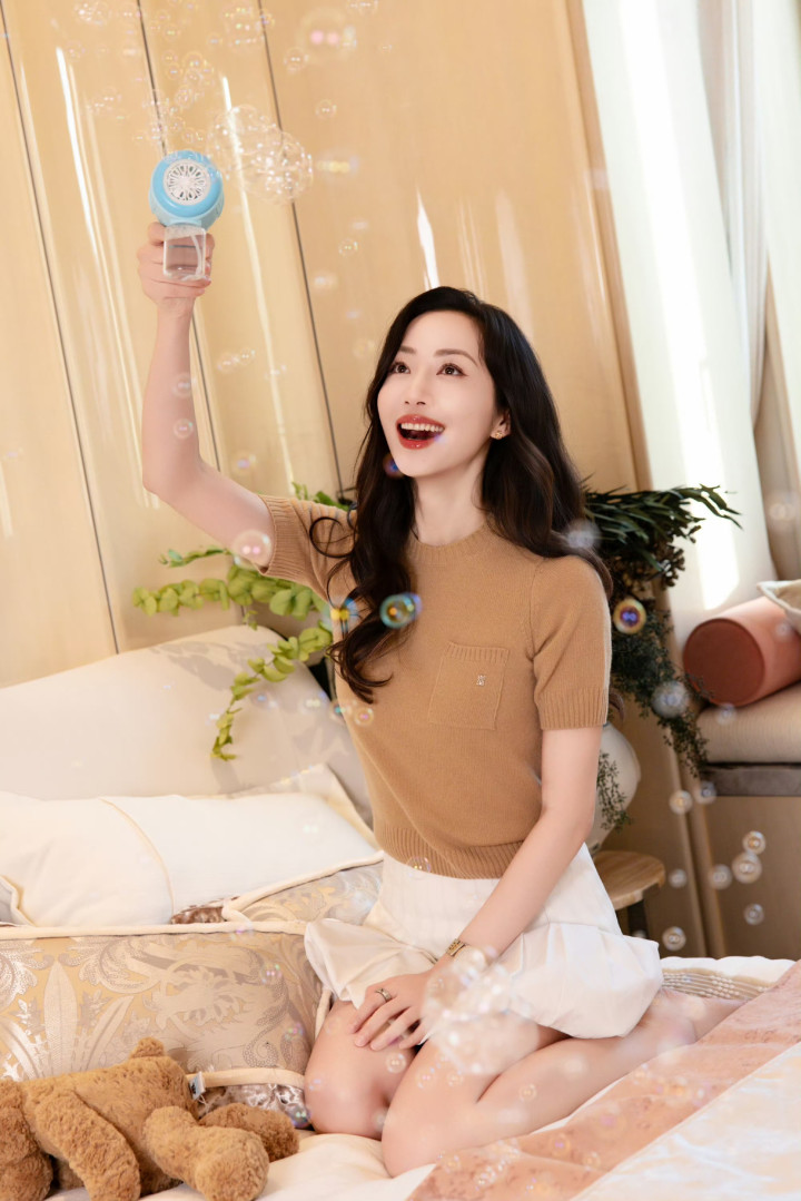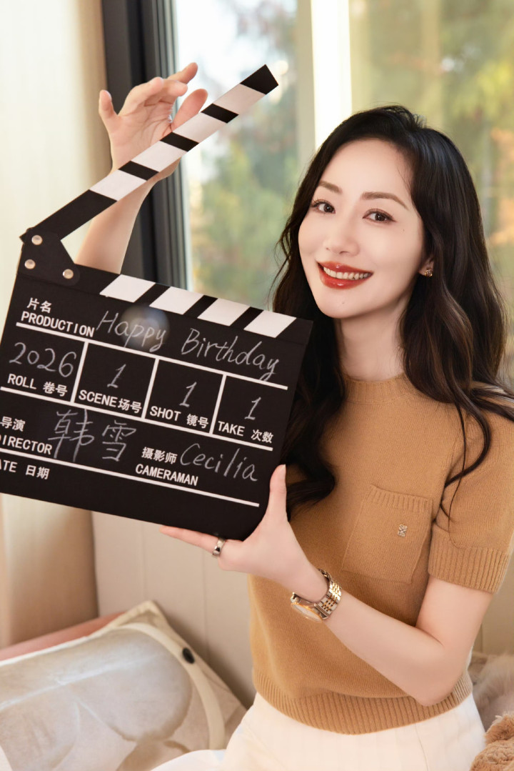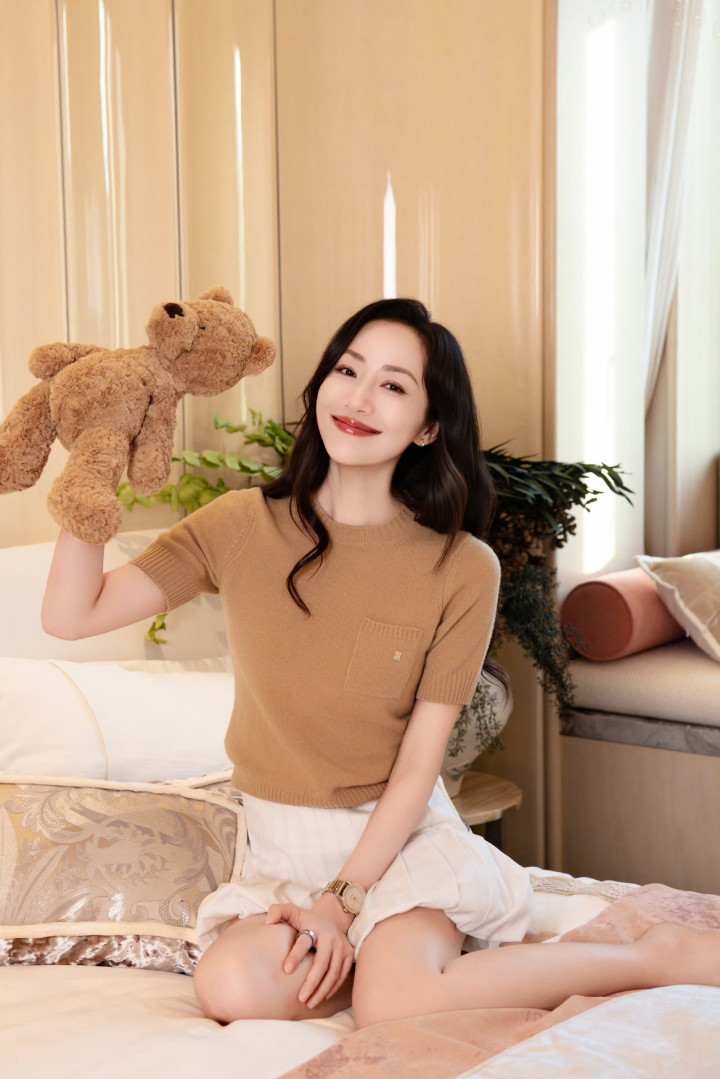 生日这天的韩雪全然卸下成熟优雅的模样,驼色短袖针织衫软糯亲肤,搭配蓬松的白色短裙,满是娇俏灵动。她举着小熊玩偶眉眼含笑,连发丝都透着被宠爱的鲜活劲儿。