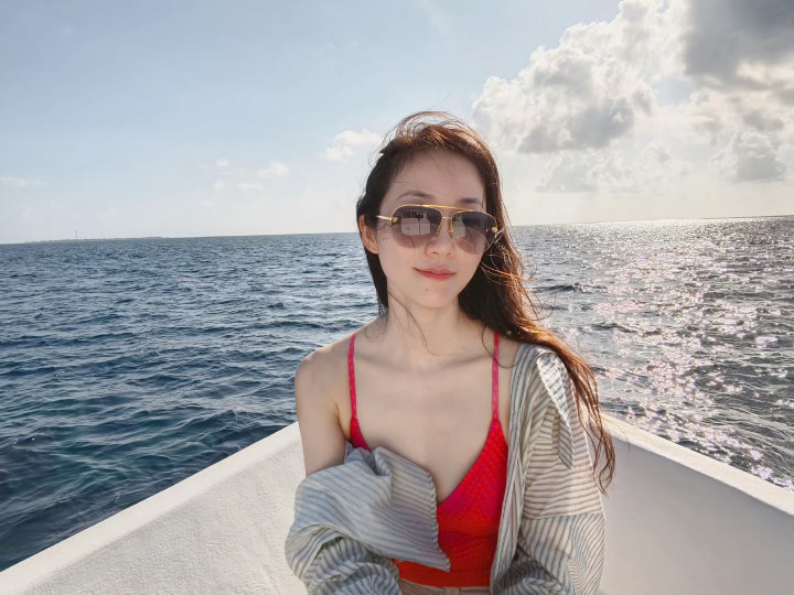 到了度假时刻就彻底松弛下来,她一身亮眼的红色吊带泳衣,外搭一件宽松的条纹衬衫,墨镜遮住半张脸,任由发丝被吹得凌乱。