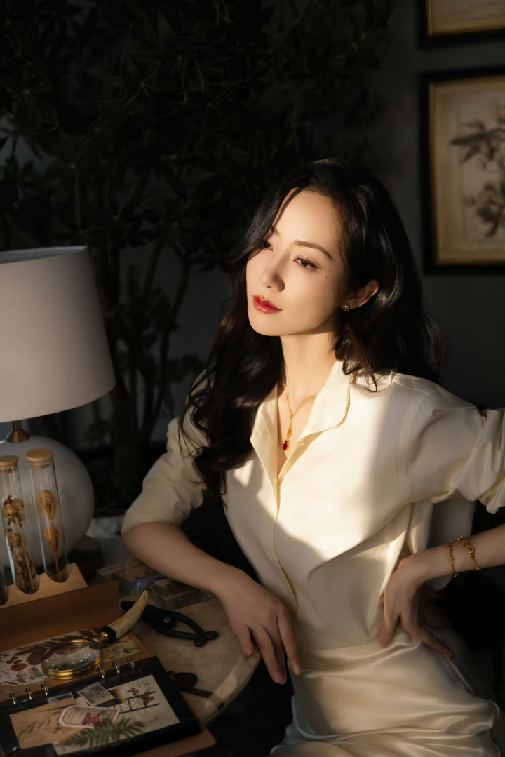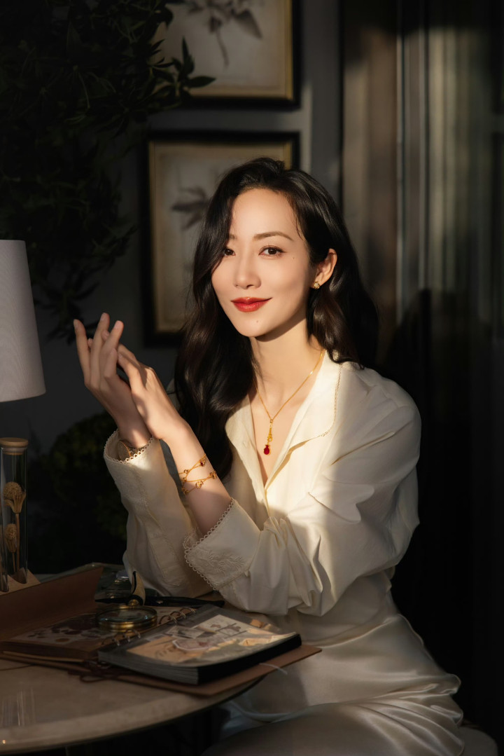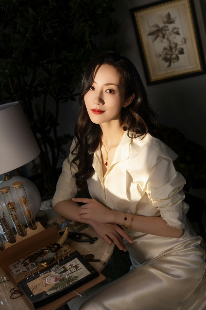 她微侧着身,轻抬双手交叠在桌沿,慵懒的波浪卷发垂在肩侧,暖黄的灯光勾勒出温润的轮廓,红唇浅笑间是藏不住的沉稳大方。