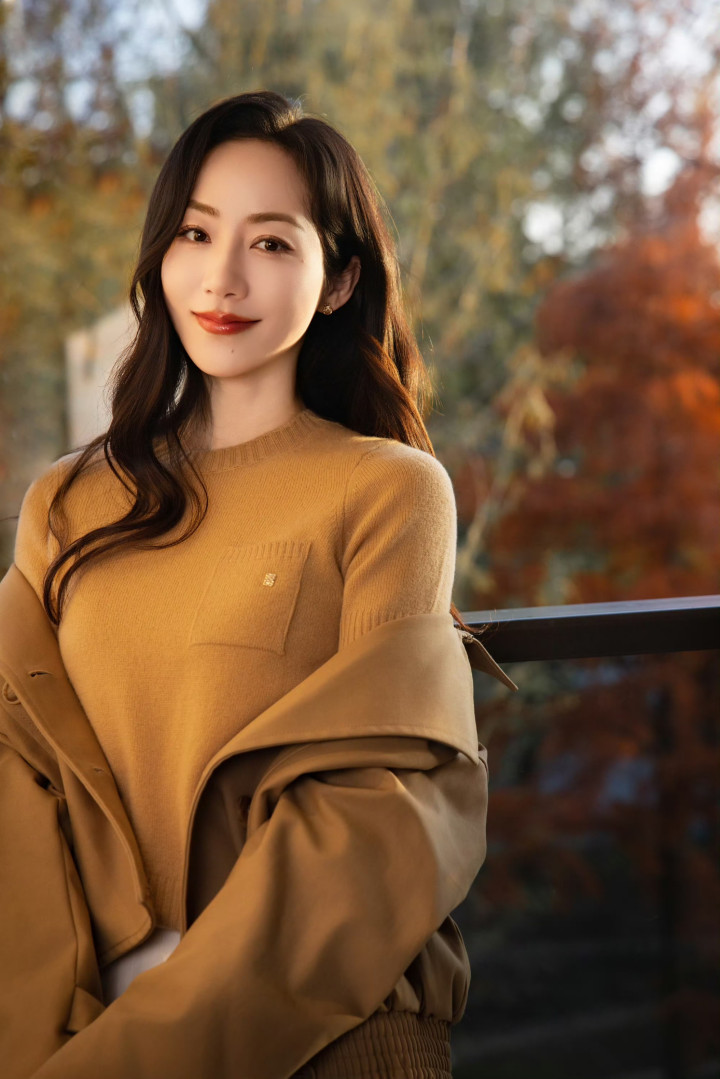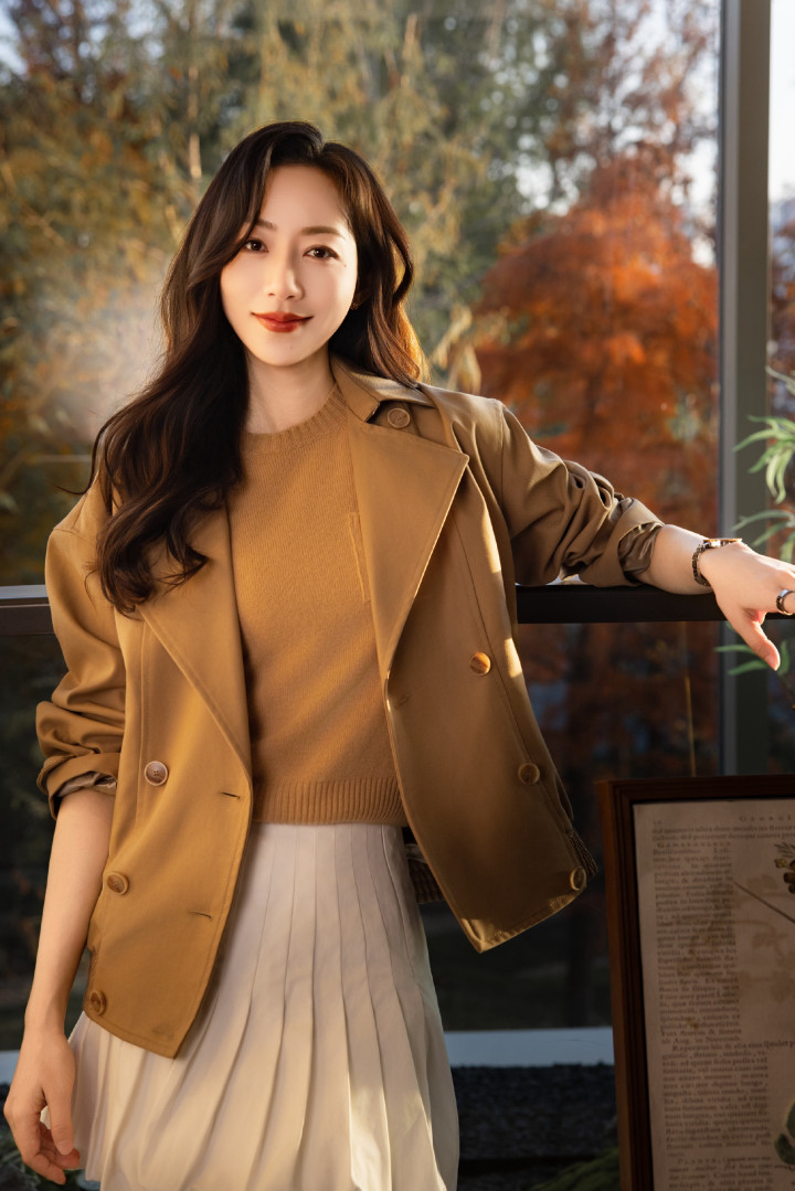静立在秋日的栏杆旁时,她微扬着下颌浅笑,眼底漾着温柔的暖意,整个人仿佛与斑斓的树影融为一体,自带沉静松弛的美感。