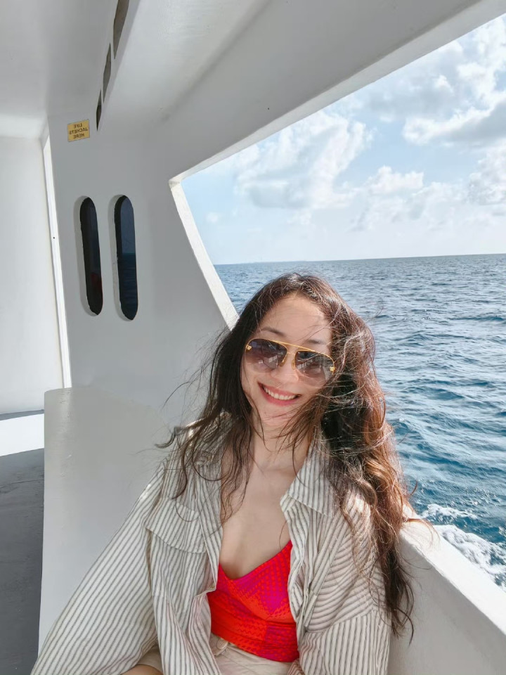整个人松弛地靠在船边,随性又自在,在波光粼粼的海面映衬下,既有度假的慵懒惬意,又透着几分不经意的性感。