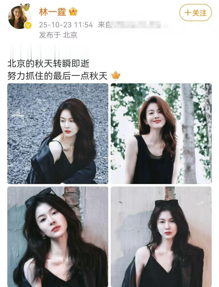 10月23日,她就发了一组照片,黑色衣服与墨镜的搭配,让她看起来酷酷的。