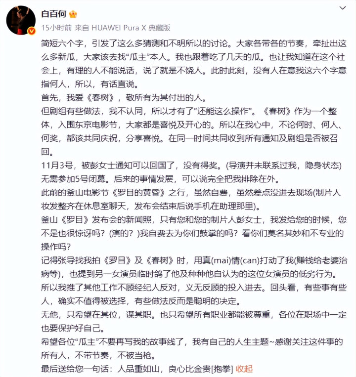 文中表示她不是不认同王哥获奖,而是剧组的做法让她不认同,自己不顾经纪人的反对,义无反顾的投入进去,却换来这种结果。