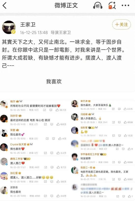 起因是那年由王家卫导演的一部电影上线后口碑却一泻千里,为了挽回票房,他亲自在微博上发了一条“我喜欢”,紧接着不少明星在评论区表示我也喜欢。