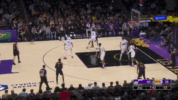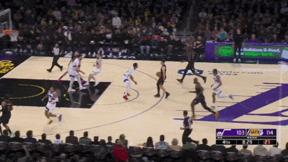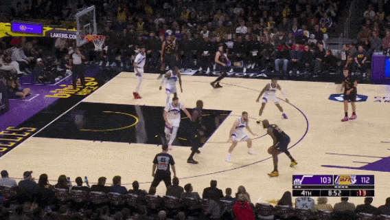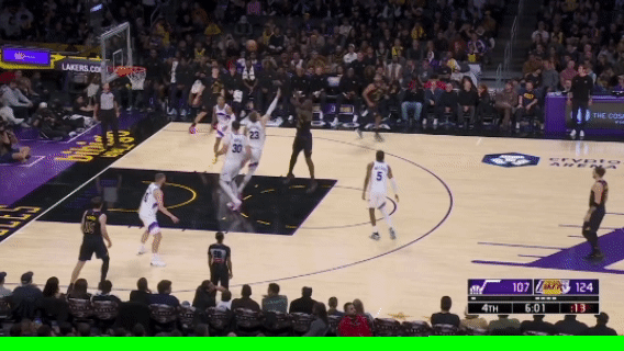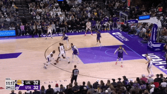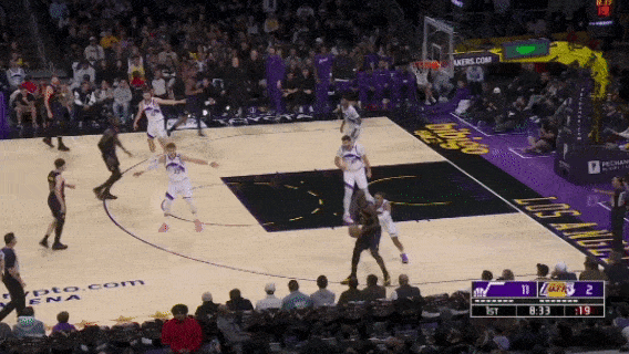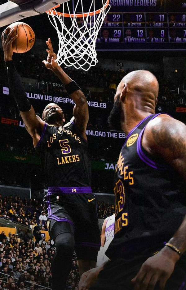 湖人打防守反击,里夫斯秒传跟进的詹姆斯,詹姆斯又回给跟进的艾顿,行云流水,艾顿一下就打开心了。
